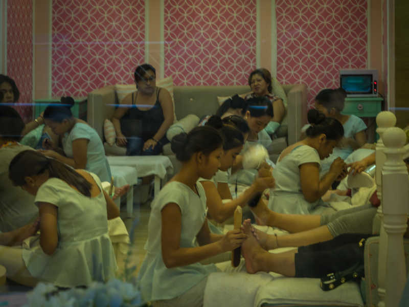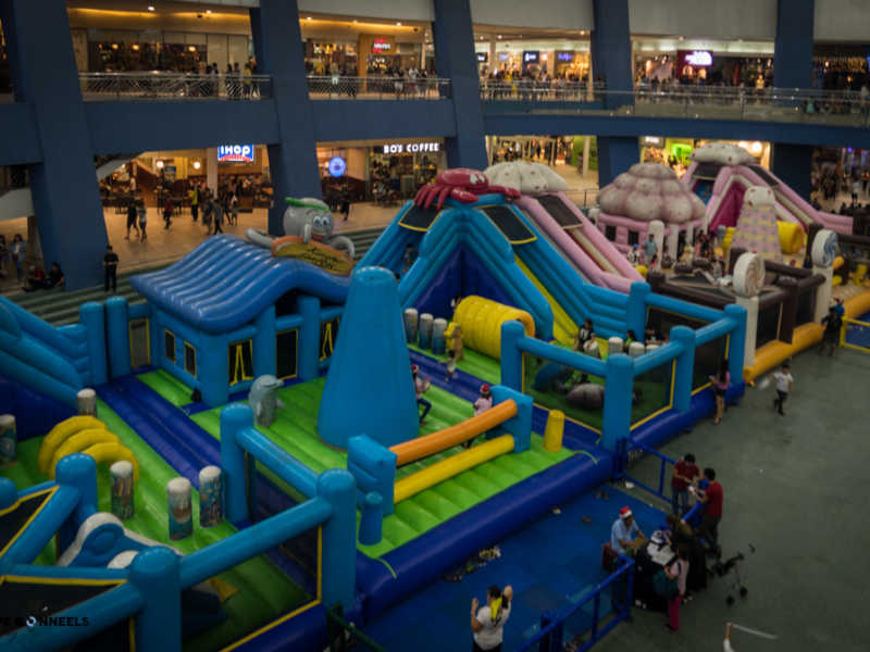 La partie préférée de Marieke est l’allée soins esthétiques. On y voit des gens se faire des manucures, pédicures, se faire maquiller, coiffer, couper la barbe et aussi se faire masser. C’est assez drôle car on y voit les gens se laisser aller, être complètement décontracter pour parfois même s’endormir complètement alors qu’autour d’eux, c’est une vrai fourmilière, bondée ! C’est assez différent des massages que je connais où l’on est seul dans une pièce avec une musique décontractante et un bruit d’eau ou de petit oiseau. Dans ce centre commercial, vous avez aussi des châteaux gonflables au moins aussi grand que ceux que j’imaginais dans mes plus beaux rêves d’enfant. Un super endroit si vous voyager avec vos enfants pour leur laisser dépenser leur énergie, pendant que vous, vous vous reposez entre deux vols ou deux longs trajets… Bien sur le tout avec un service irréprochable que ce soit par le service de sécurité bien présent ou la personne qui appuie pour vous sur le bouton de l’ascenseur ! Dans un décor évoluant en fonction du moment (ici c’est bientôt Noel). Moi qui n’aime pas les shoppings habituellement, je trouve celui-ci amusant, bien fait. Bon, OK, il y a un monde de fou en cette période proche des fêtes mais cela reste aéré.