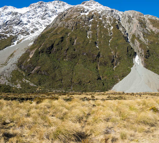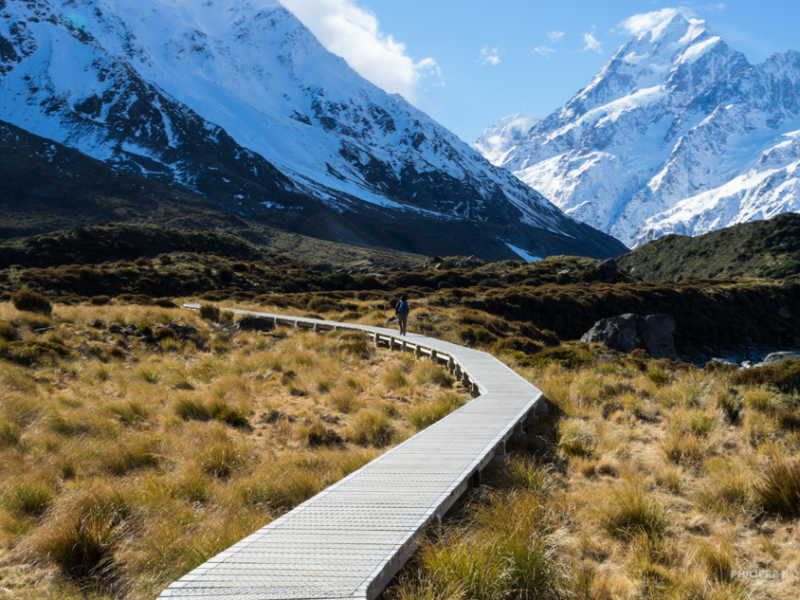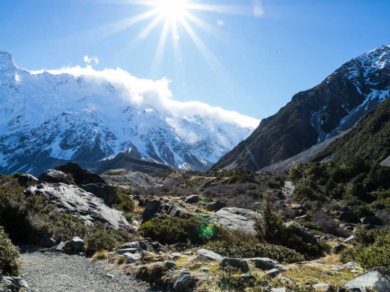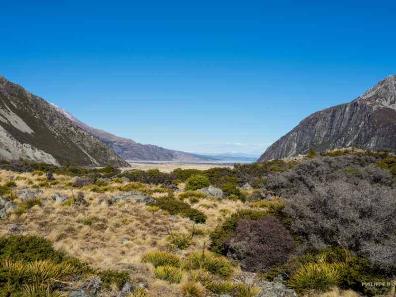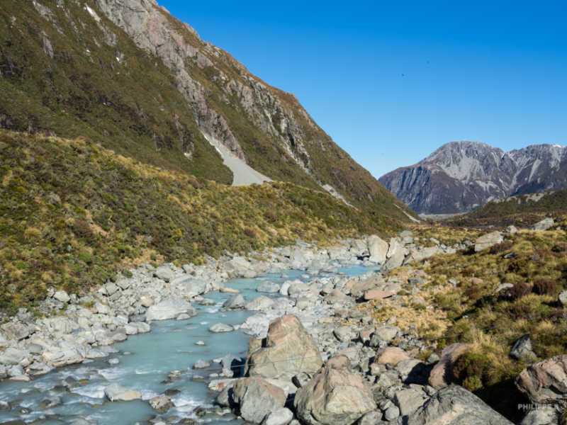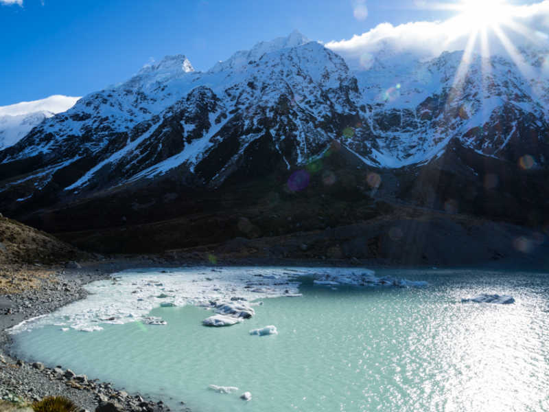 Retournons à nos moutons ! Nous avons eu une belle journée, chaude et ensoleillé, propice à une belle randonnée au pied de ce mont majestueux. Notre marche nous amène jusqu’au lac Hooker, qui est le lac de fonte du glacier Hooker.
