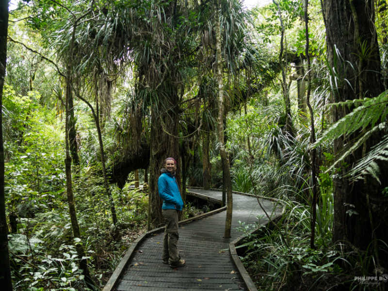 Après cette petite excursion nous passons notre chemin dans la forêt de Kaoris. Il y a pleins de randonnées et de point de vue, nous avions envie d’aller observer le plus grand des Kaoris, qui est aussi un des plus vieux, il a plus de 2000 ans. Ces arbres ont une certaine fragilité, due aux bactéries que l’on peut ramener avec nos chaussures (d’où les bio contrôle à l’aéroport). Du coup l’association en charge de la protection de ces arbres a mis des decks surélevé pour qu’on marche dessus afin de ne rien y déposer. Mais comme ce n’est jamais parfait comme seule protection, ils ont aussi mis en place avant le chemin une petite station de « shoeswash », brosse, tapis et spray à faire rentrer en contact avec la semelle de vos chaussures ! Merci à eux pour cet acte citoyen !