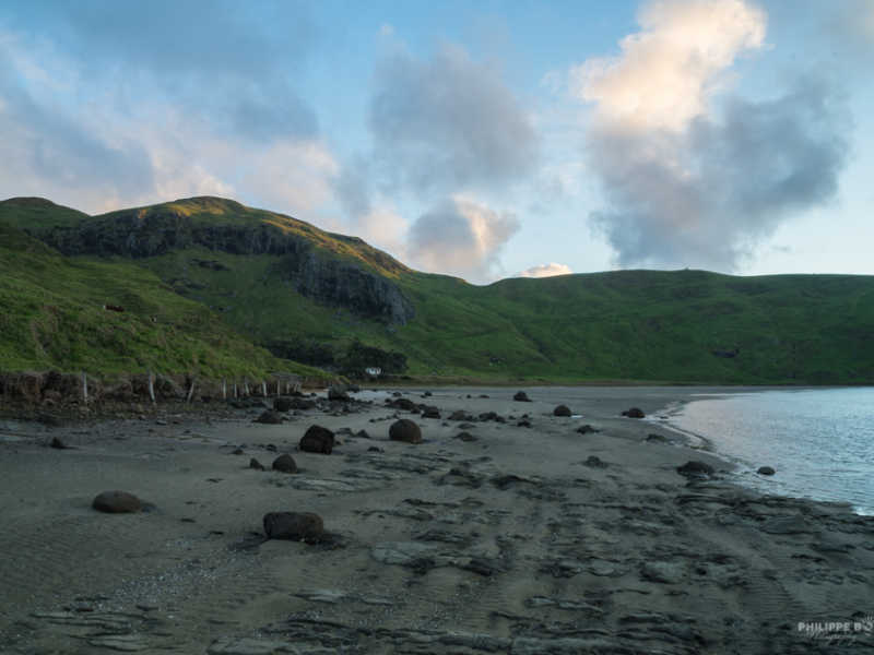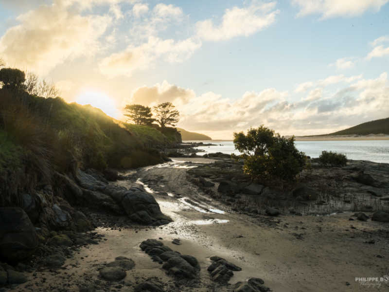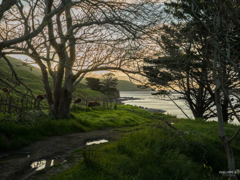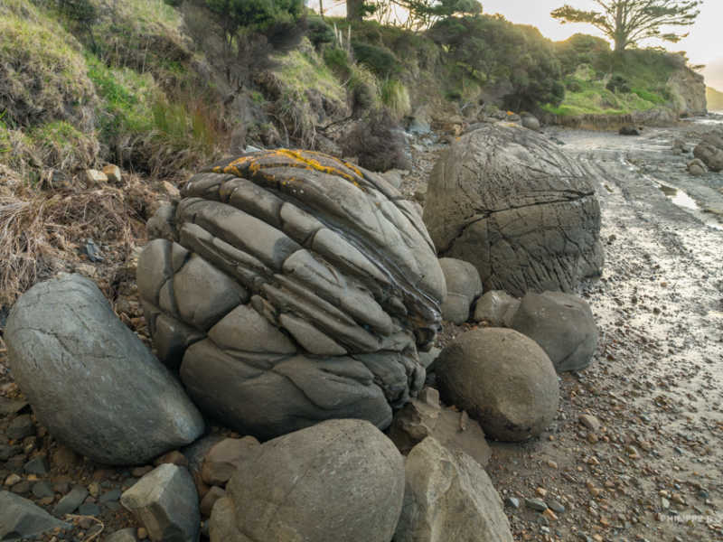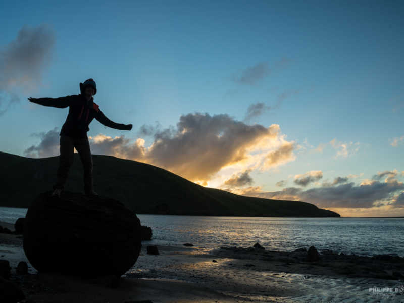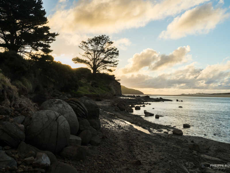 Sorti de cette péninsule septentrionale, nous redescendons un peu plus pour nous trouver un endroit où camper ce soir. C’est au bout d’un chemin en terre que nous trouvons cette magnifique plage dont le coucher de soleil nous offre de belle couleur. De plus nous faisons une découverte archéologique, car on nous avait dit qu’il n’y avait qu’à Moreaki que les rochers étaient ronds mais nous en avons trouvé d’autres ?!