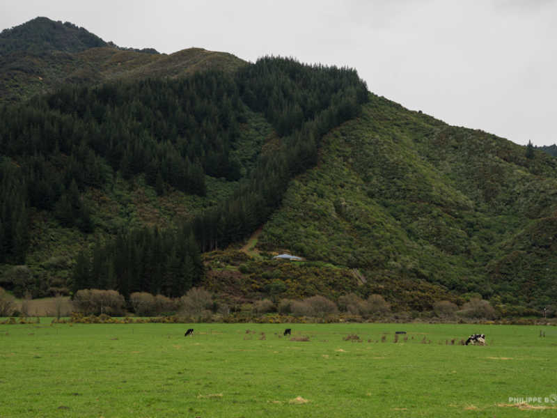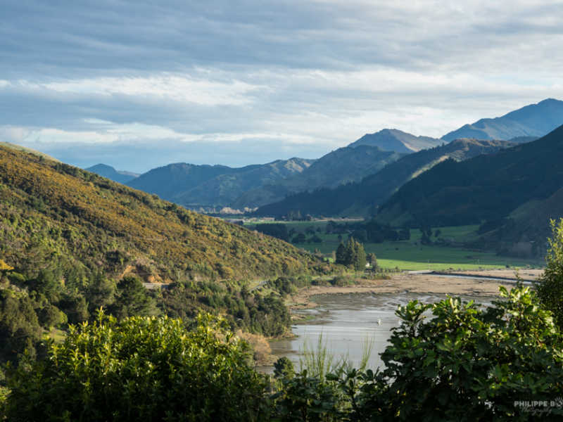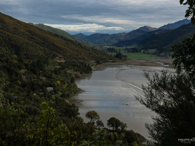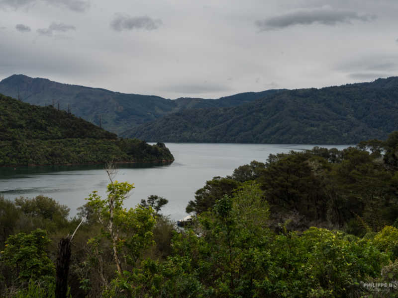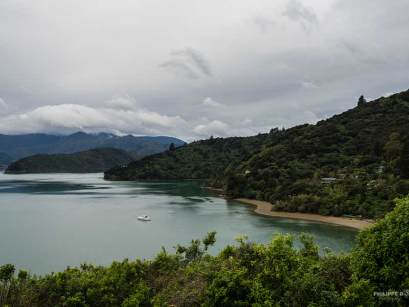 Que faire, prendre la petite route qui a l’air vraiment mignonne et qui longe le bord de mer ou la grosse route toutes droite mmm… ben la petite bien sûr ! Direction les Malborough Sounds. Les paysages malgré le temps nuageux sont vraiment beau, la route est mignonne mais sinueuse, vraiment sinueuse.