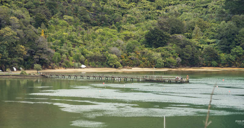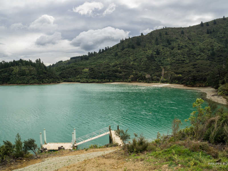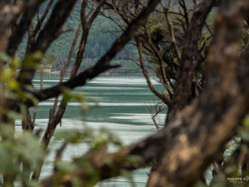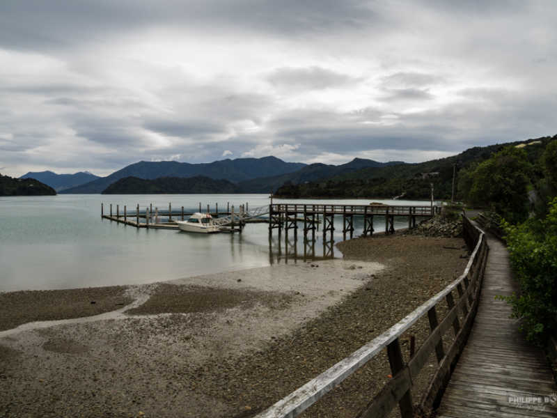 Après 2-3 heures de route ça fatigue le chauffeur et ça rend malade la co-pilote. On tient le coup et on arrive jusqu’à la croisée des chemins prêt de Port Gore, il n’y a plus que de la piste, notre périple s’arrête pour aujourd’hui ici. Enfin presque ; il faut maintenant rebrousser chemin, direction le camping à 3 heures de là. Pas de regret on en a vu déjà pas mal et il nous reste plus qu’à imaginer les paysages sans nuages. C’est un petit coin de paradis loin de tout, à quelques heures (4-5 heures de route sinueuse aller) de Picton.