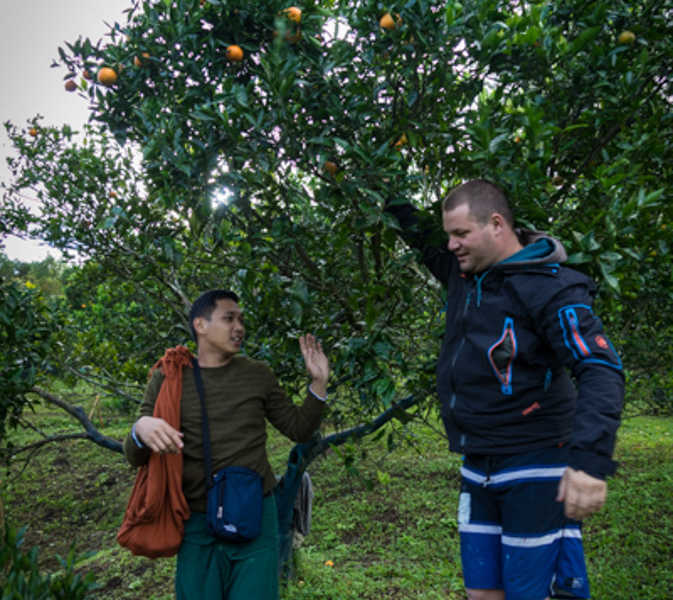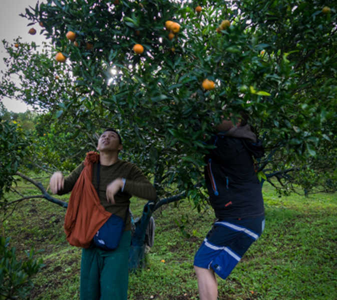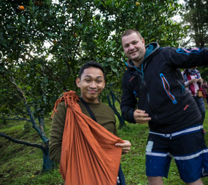 Nos amis et nous décidons après cette très agréable, mais longue, journée d’aller, à 4h DU MATIN, voir le soleil se lever sur Sagada, au lieu-dit Kiltepan. Ce site méconnu il y a encore quelques années est devenu célèbre, grâce au happy end dans une série TV, une love story très apprécié aux Philippines. Pour une heure aussi matinale, il y a vraiment beaucoup de monde. Mais il est vrai que l’endroit donne de très belle couleur avec une superbe vue plongeante. Toujours en compagnie de nos amis et sur leurs bons conseils, nous allons prendre le petit déjeuner dans un domaine particulier du coin. Particulier dans le fait qu’il y a un une plantation d’orangers. Cela peut vous paraitre bizarre mais sachez qu’ici aux Philippines, les oranges, ce n’est pas très commun. Vous n’en trouverez pas partout. Alors, pendant que le petit déjeuner se prépare nous allons cueillir, directement dans le domaine les oranges qui nous semble les plus juteuse pour qu’elles accompagnent notre petit déjeuner. Mmmh, un bon jus d’orange frais !