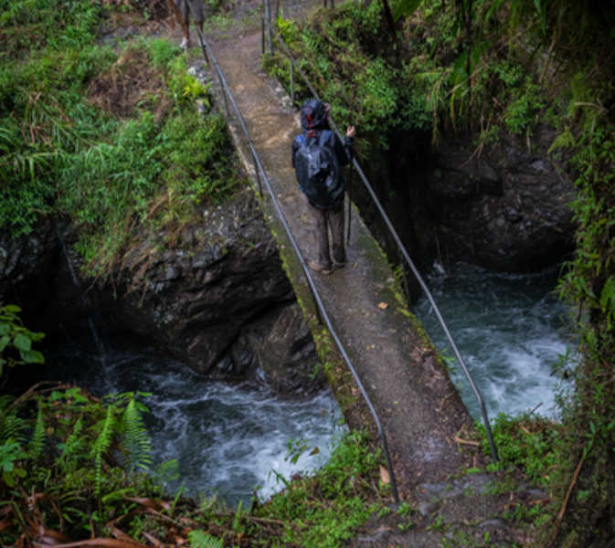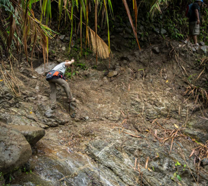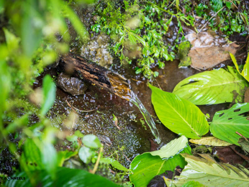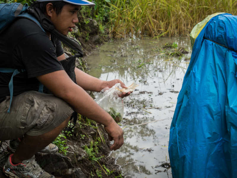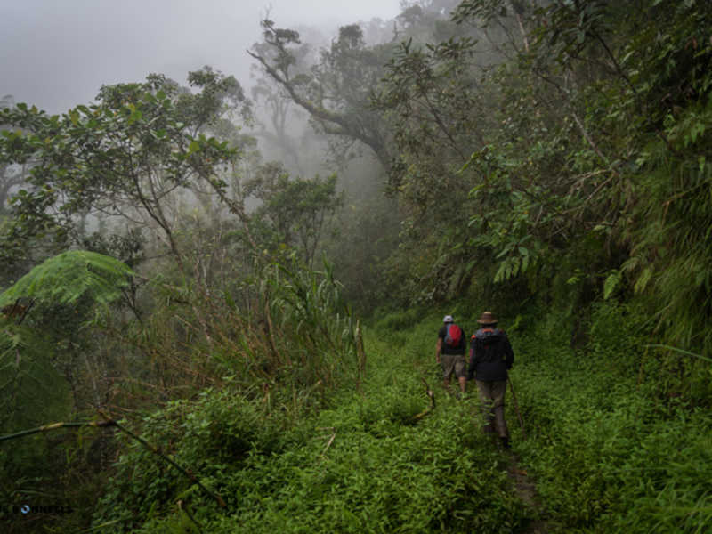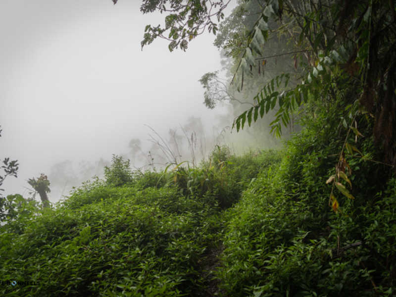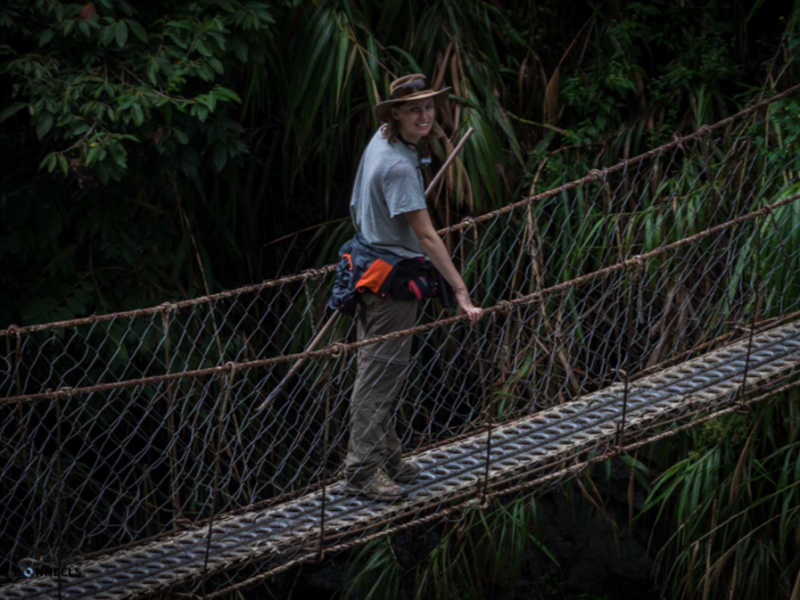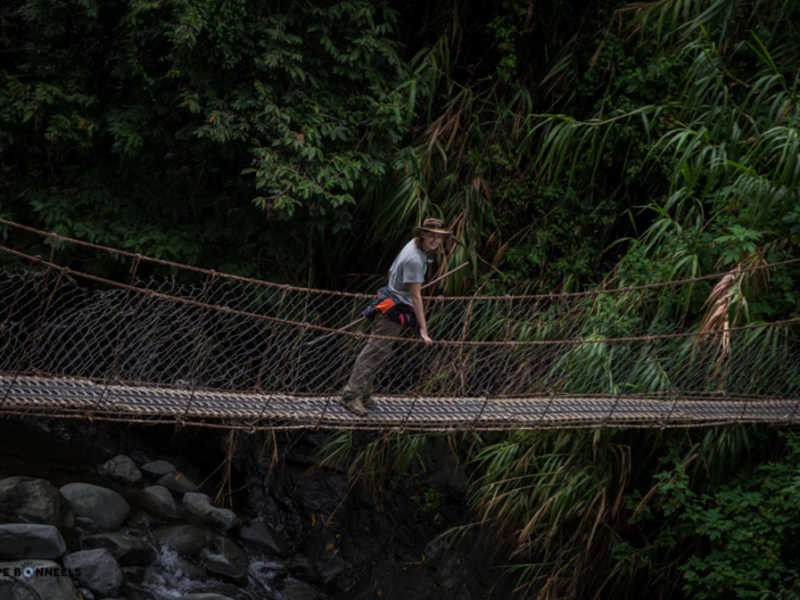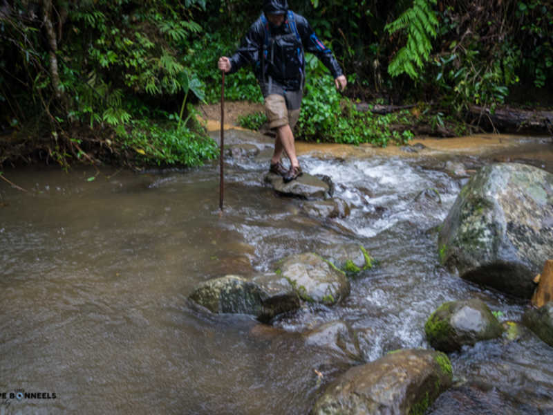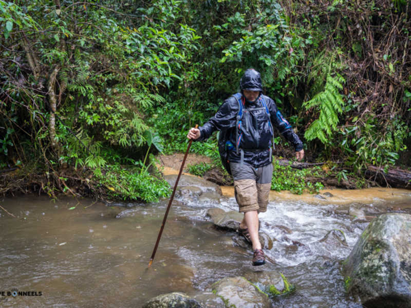 Nous avons eu moins de chance avec le temps comme vous pourrez le voir sur les photos. Je vous le disais ci-dessus, nous sommes en fin de saison des pluies ! Cette journée nous le rappel bien, par cette pluie, d’abord sous forme de crachat incessant, pour continuer en pluie diluvienne amenant des torrents sur le petit chemin de chasseur que nous empruntions !! Elle nous a rendu la tâche difficile, mais amusante. Au début de la marche, on évitait les flaques d’eau pour ne pas se tremper les pieds mais à la fin, la pluie était tellement forte que le chemin est devenu une mini rivière. Impossible d’éviter les pieds mouiller dans ces conditions, enfin, pas juste les pieds d’ailleurs. La pluie était tellement forte à certain moment, qu’on avait littéralement l’impression qu’on nous jetait des seaux d’eau en permanence dessus !! (Vous comprendrez les quelques traces de goute d’eaux sur certaine photo) La fatigue, mêlée aux conditions difficiles, nous amène à de bon délire, rien de tel qu’une bonne décompensation pour garder le moral. Comme ceux qui nous suivent au jour le jour ont pu le voir sur Instagram, cela nous a bien fait rire et donné du baume au cœur pour la suite et fin de journée.