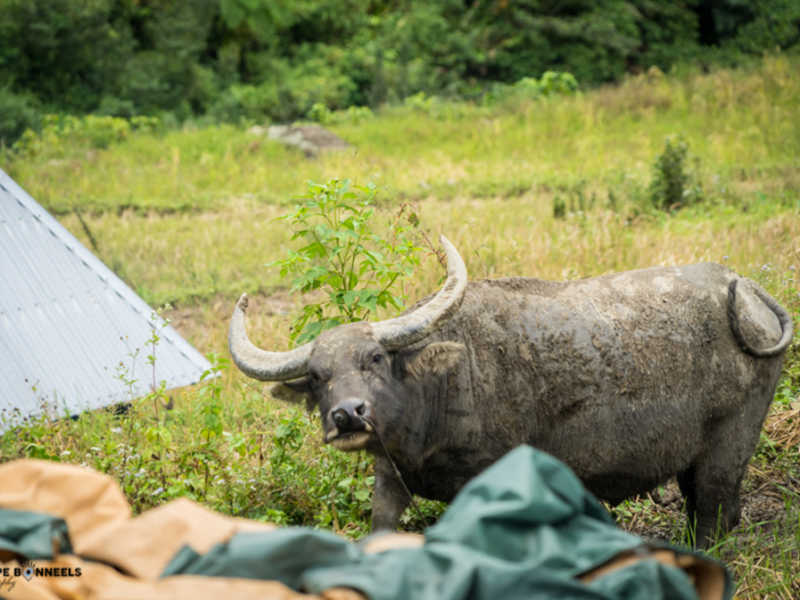 Cela sera la partie la plus difficile de la journée ; 5 heures d’escalier. Mais, nous avons de la chance, car il n’y a pas trop de soleil ! Ça peut paraître étrange ce que je dis là, mais comme la chaleur est déjà tellement présente, si le soleil pointe le bout de son nez ça devient insoutenable. Pour l’instant nous avons quelques petites averses rapides qui nous rafraichissent, affaire à suivre… On a tellement de chose à vous raconter sur cette journée ! Les enfants occupés à fortifier une terrasse familiale avec les pierres remontées de la rivière en contre bas, le tout sous forme de jeu avec un immense sourire, la vieille dame a l’abris de son sac plastique qui laboure sa terrasse avec l’eau jusqu’aux genoux, ainsi que des paysages à couper le souffle… Je vous laisse apprécier cela dans la galerie